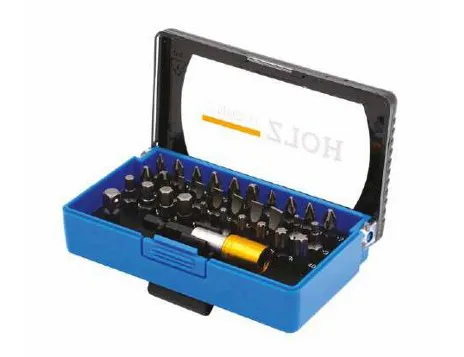 Bopite de 32 embouts avec porte-embout magnétique. Bôite en plastique rigide anti-choc, avec crochet pivotant pour être fixée à la ceinture de l’opérateur ou sur des éétagères et autres supports. Ouverture rapide de la boîte pour changement d’embouts. 32 pièces assorties avec porte-embout magnétique.
